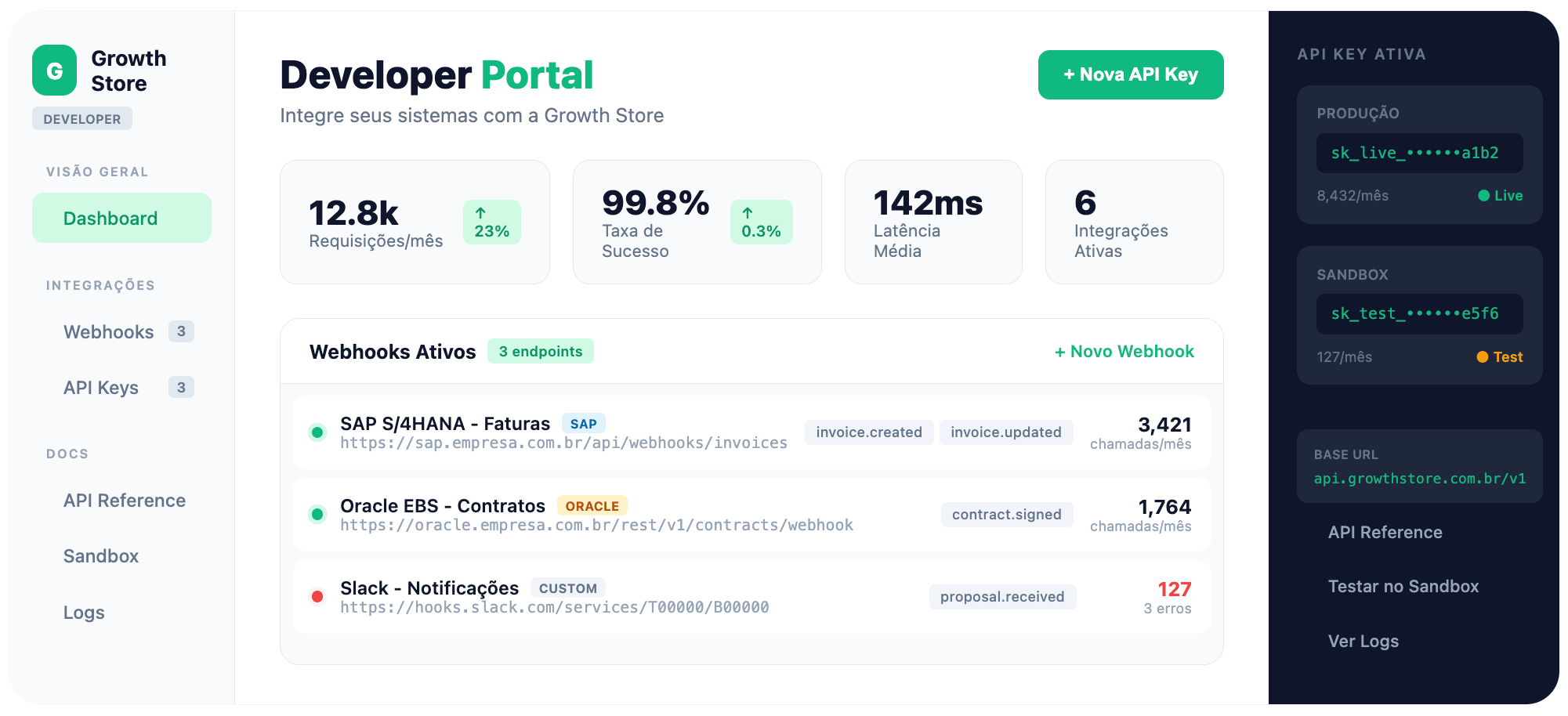 A Growth Store não substitui seus sistemas — se encaixa neles. APIs e webhooks prontos para conectar ao seu ERP, ITSM, CLM, BI e ferramentas de comunicação.