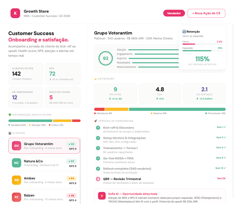 Onboarding guiado, health score, NPS e CSAT. Garanta adoção e reduza churn antes que aconteça.