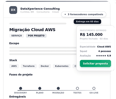 Contrate do discovery à entrega de projetos de implementação, migração, integração e consultoria técnica — organizados por stack, especialidade e tipo de entrega.