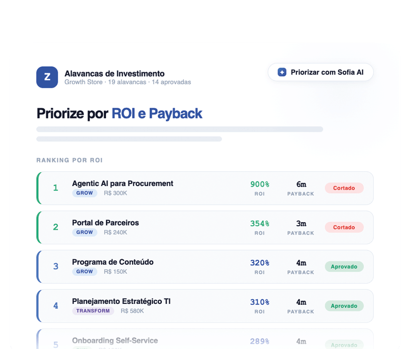 O ZENO centraliza todas as alavancas com ROI comparável, forçando trade-offs explícitos antes da reunião de aprovação.