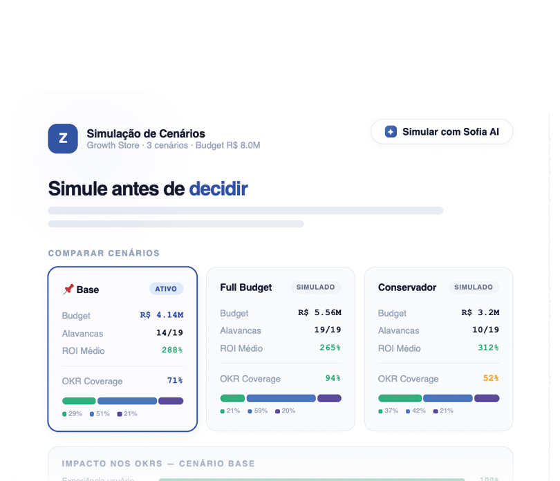 O ZENO conecta cada real investido a um OKR, com critérios de priorização transparentes e simulação de cenários antes da decisão.