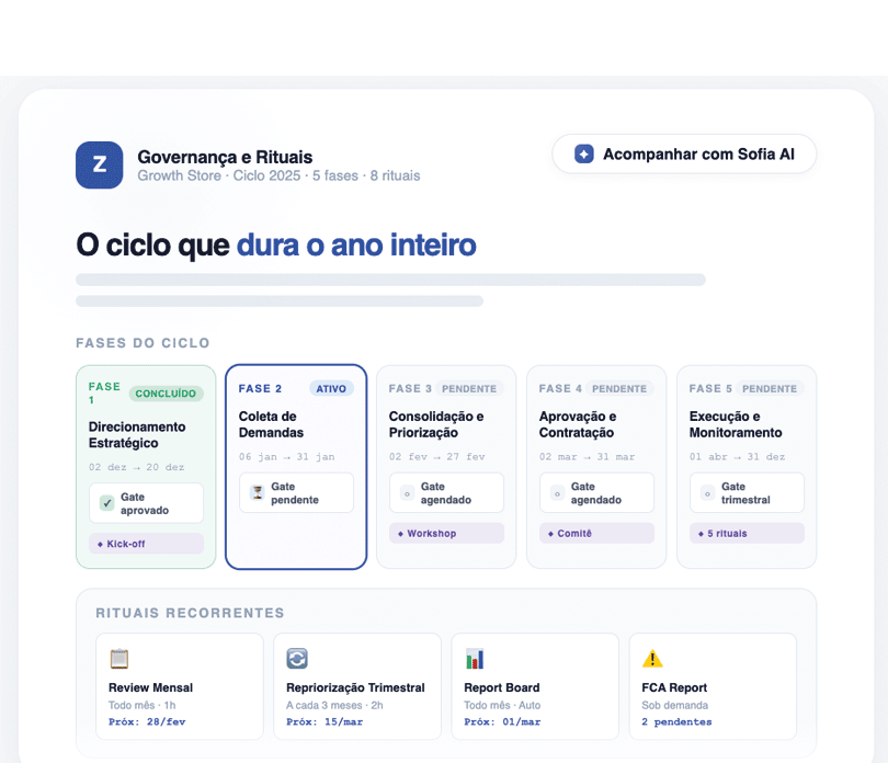 Ciclo de governança configurável com fases, gates, rituais e rolling planning. O plano acompanha a realidade, não o contrário.